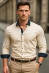 Elevate your style with the Men’s Slim Fit Beige Shirt with Navy Blue Details.